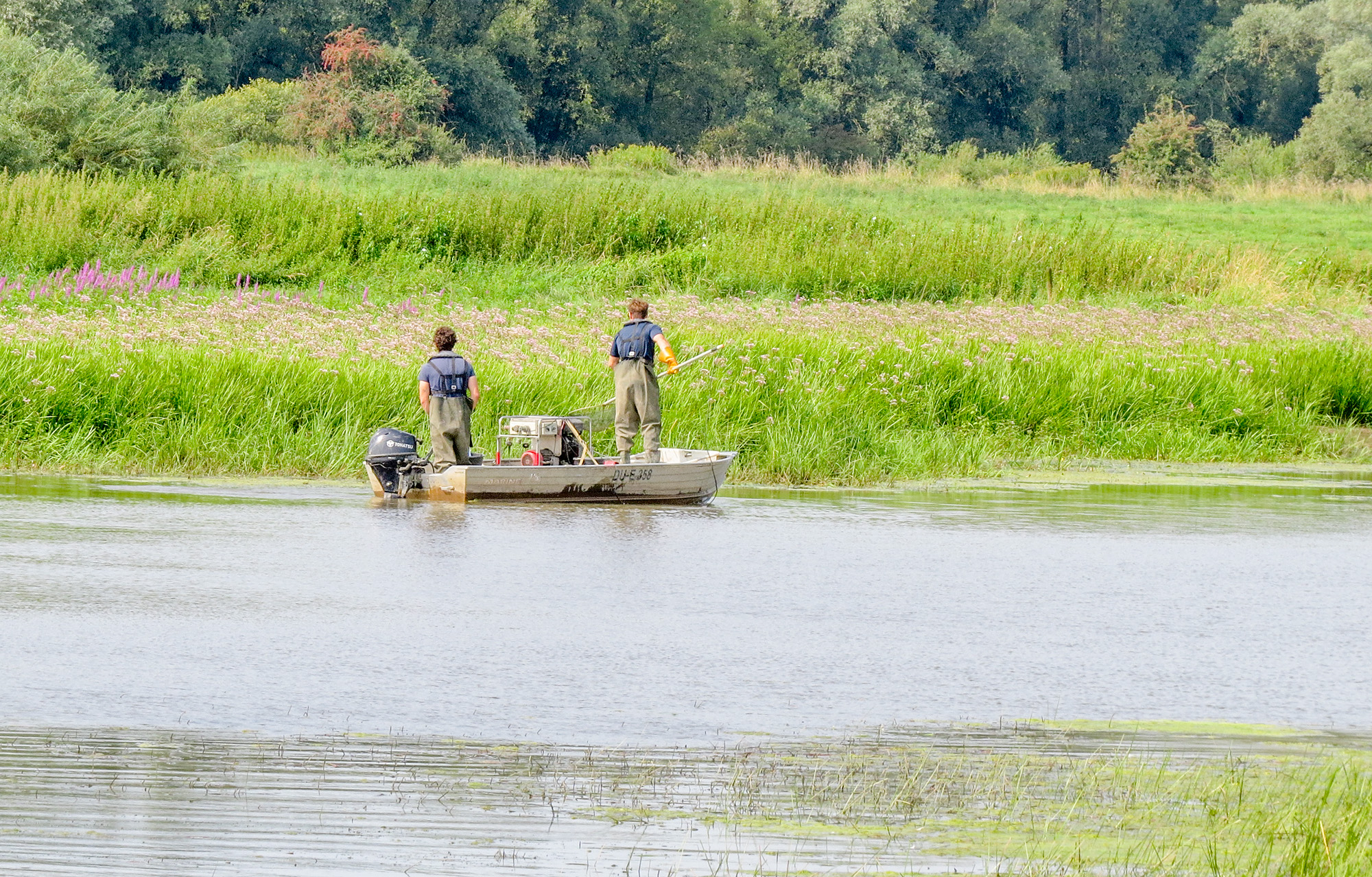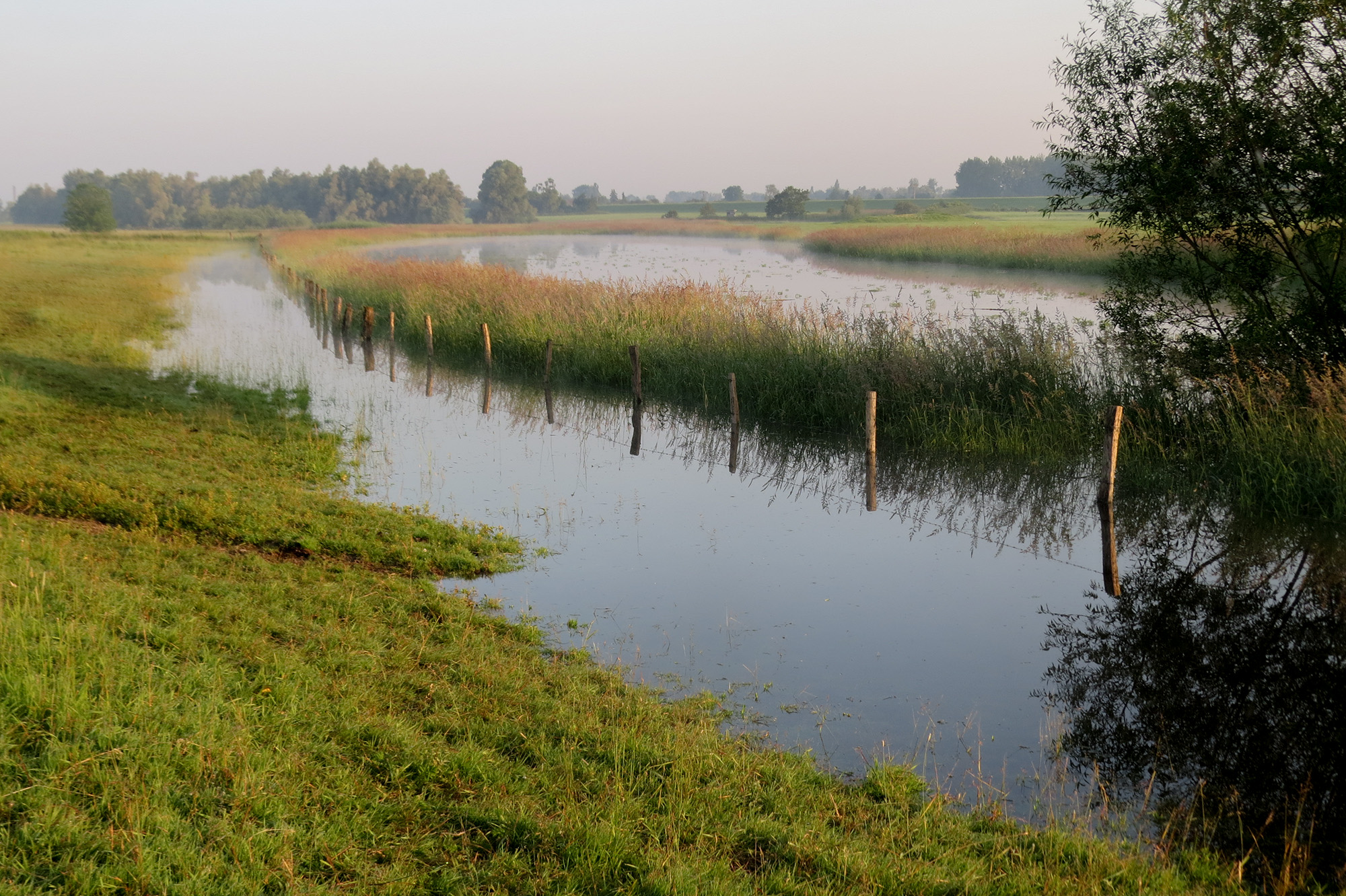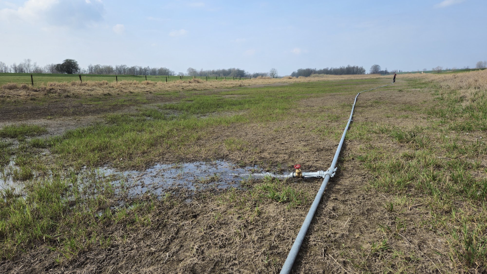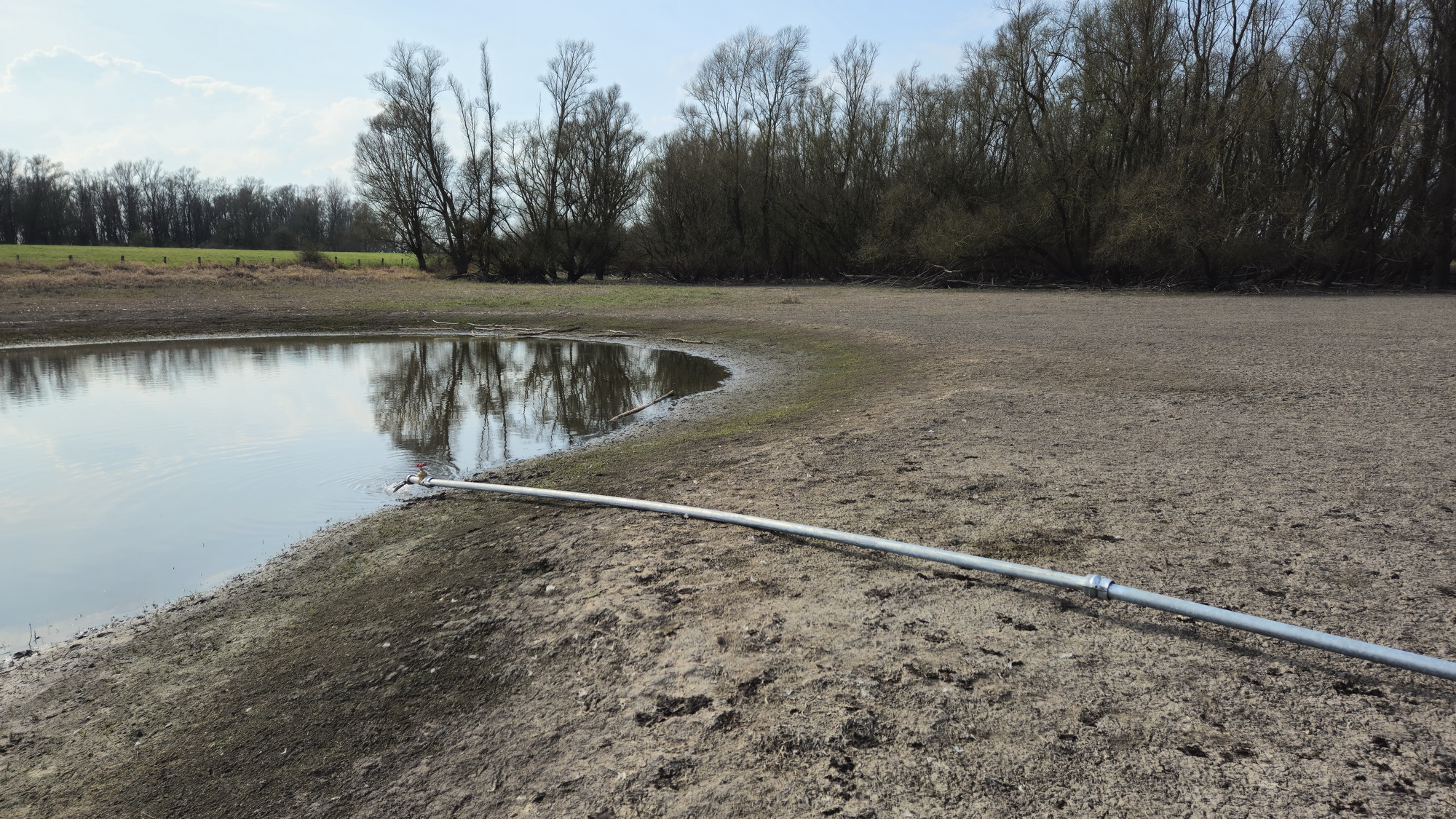 Dieses Frühjahr wird zum ersten Mal seit Einrichtung die aktive Bewässerung benötigt, denn in den Flutmulden ist bereits ungewöhnlich früh kaum noch Wasser vorhanden. Dank des Einsatzes unserer Freiwilligen sind die Pumpen nun eingeschaltet und können die Feuchtwiesen des Auengebiets mit Wasser versorgen. Seit letztem Jahr steht in der Emmericher Ward die neue Bewässerung aus solarbetriebenen Pumpen zur Verfügung. Über oberirdisch verlegte Rohre kann hochgepumptes Wasser in den Flutmulden des Gebiets verteilt werden. Hierbei handelt es sich um einen geschlossenen Kreislauf: Das Wasser wird aus dem Boden hochgepumpt und versickert wieder in diesem.