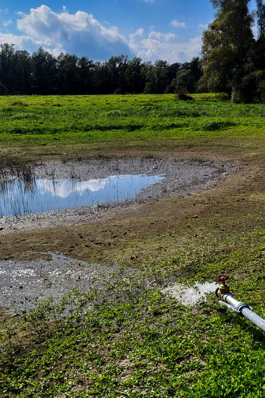 Das erstmals eingeschaltete Bewässerungssystem versorgt die austrocknenden Flutmulden mit Wasser. (© NABU-Naturschutzstation Niederrhein)