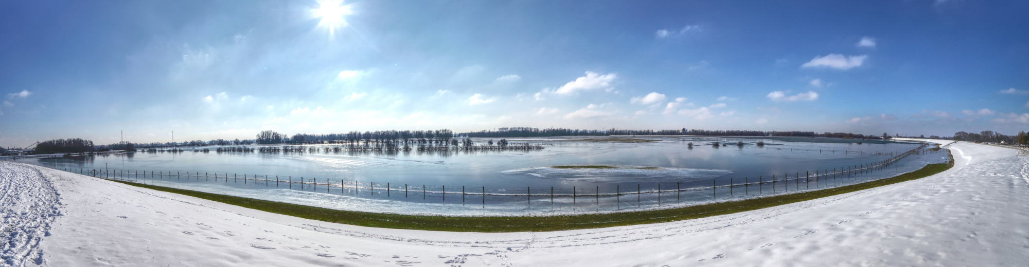 „Richtiger“ Winter am Niederrhein! Auch in der Emmericher Ward liegen bis zu 50 cm Schnee! Teile der überschwemmten Emmericher Ward sind gefroren und die Gänse haben sich andere Rastplätze gesucht. Nachdem das Wasser etwas zurückgegangen ist, kann genau gesehen werden, wie hoch es stand. Die grünen Flächen lagen während des Schneefalls unter Wasser und kommen nun wieder zum Vorschein.