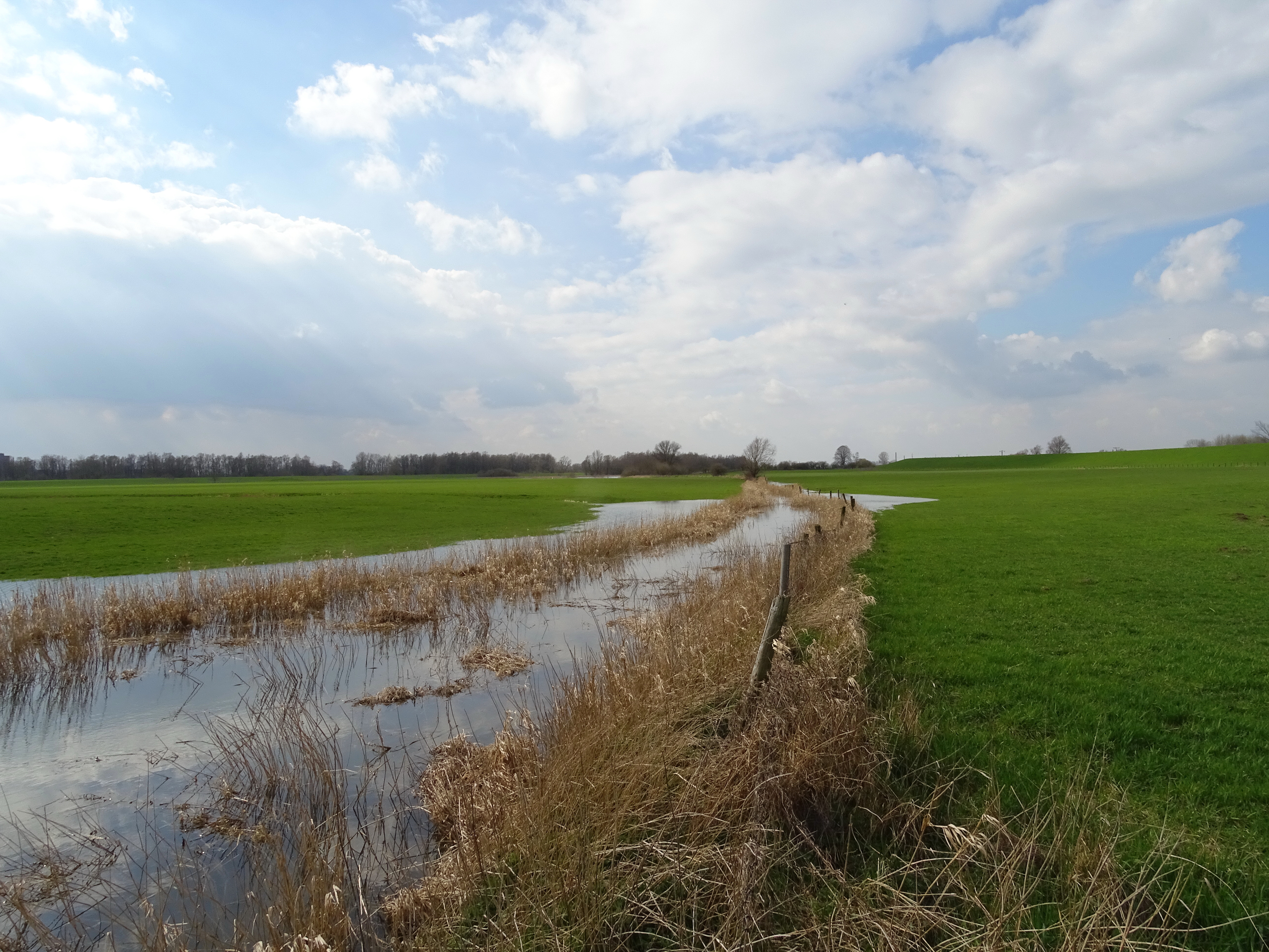 Die Niederschläge der letzten Tage und die Schneeschmelze in den süddeutschen Bergen und den Alpen sorgten für ein kleines Rhein-Hochwasser. Auch in der Emmericher Ward, einem Naturschutzgebiet an der Deutsch-Niederländischen Grenze bei Emmerich am Rhein, stieg demzufolge der Wasserstand an und sorgte für erhöhten Wasserstand im Gebiet. Deutlich zu erkennen sind nun alle tieferliegenden Bereiche, die mit Wasser gefüllt sind.