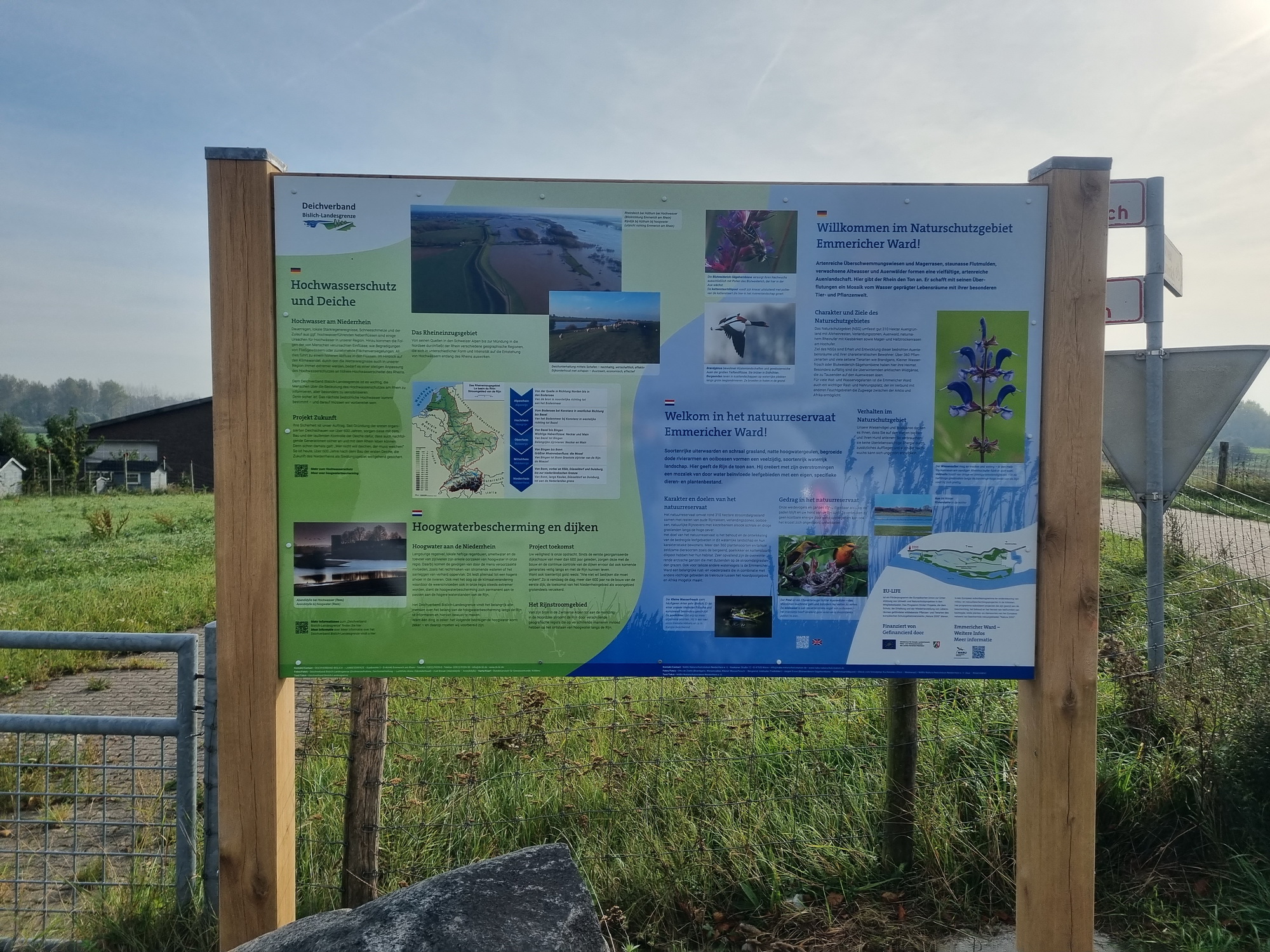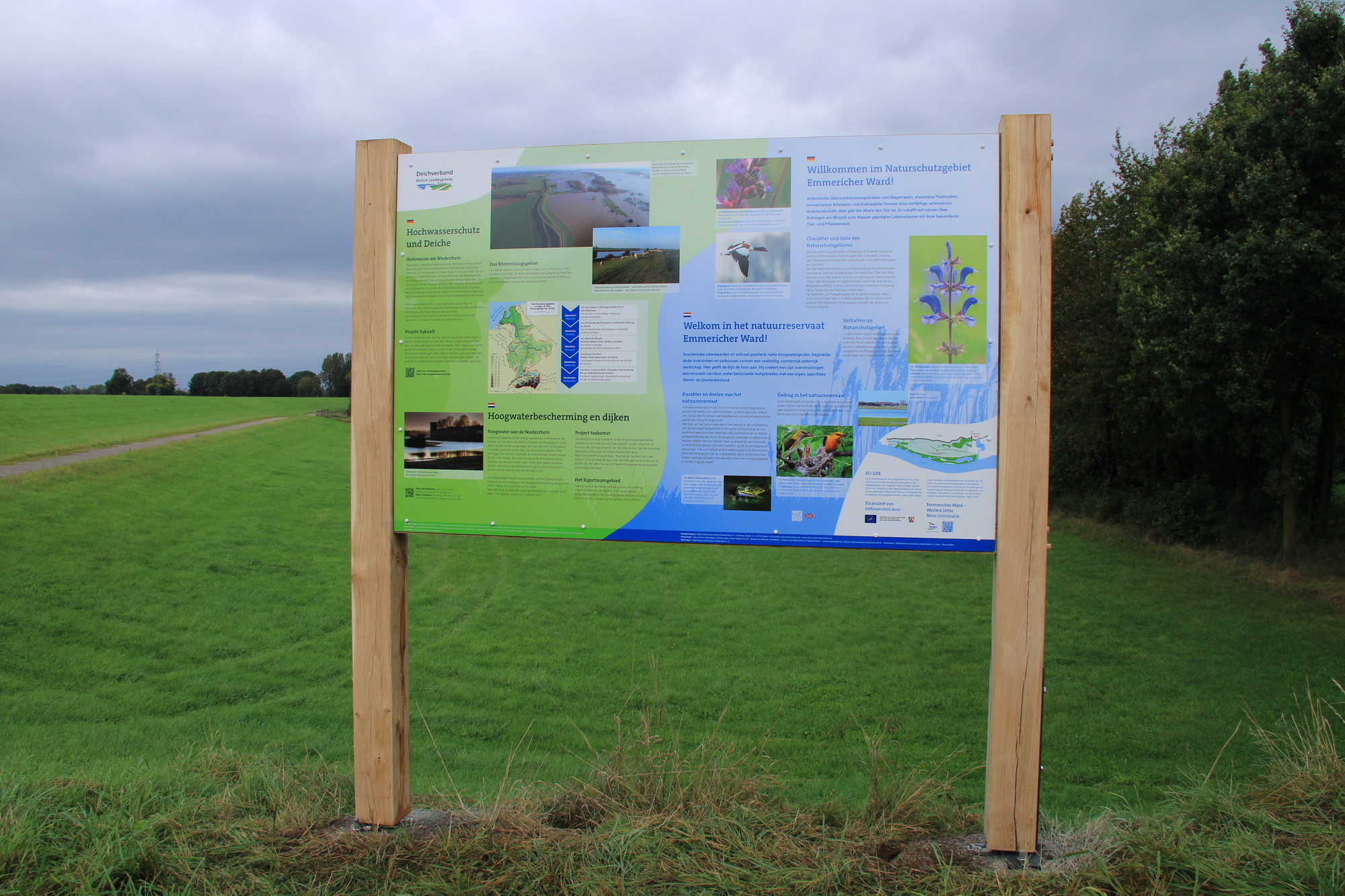 Die Bauarbeiten in der Emmericher Ward sind noch im vollen Gange und werden voraussichtlich Ende Herbst diesen Jahres abgeschlossen sein. Gute Nachrichten gibt es auch für alle, die gerne auf dem Banndeich an der Emmericher Ward entlang spazieren gehen oder Fahrrad fahren. Drei neue Infoschilder wurden in den letzten Wochen aufgestellt und informieren über Flora und Fauna des Feucht- und Vogelschutzgebietes, dessen Erhalt und Entwicklung sowie den Hochwasserschutz.
