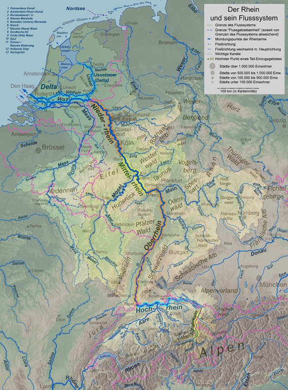 Der Rhein wird unterteilt in den Alpenrhein, den Bodensee (bestehend aus Obersee, Seerhein und Untersee), den Hoch-, Ober-, Mittel-, Niederrhein und das Rheindelta. Seine wichtigsten Neben- bzw. Zuflüsse sind die Aare, die Maas, die Mosel, der Main und der Neckar.