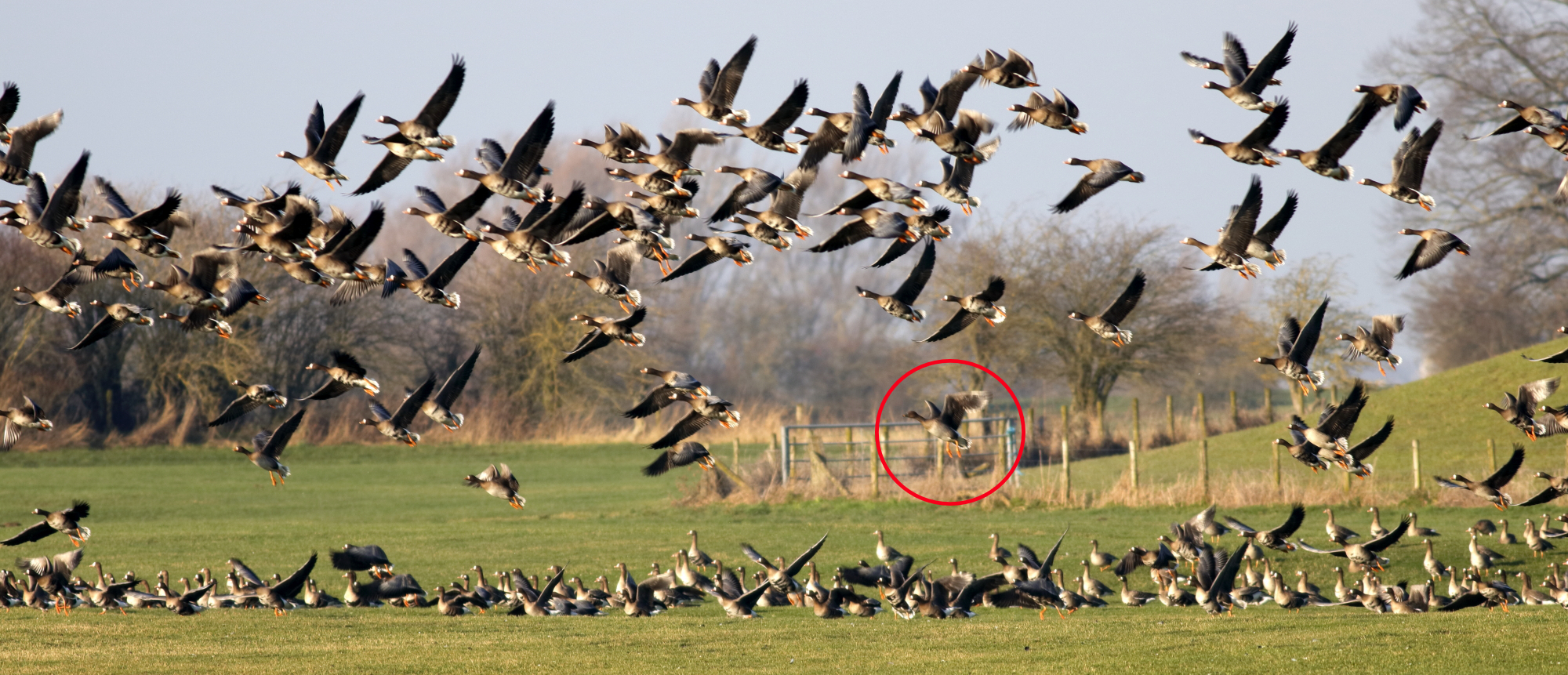 Ein Schwarm Blässgänse in der Emmericher Ward. Mindestens eine Saatgans ist auch auf dem Foto, im roten Kreis (Foto: Thomas Chrobock).