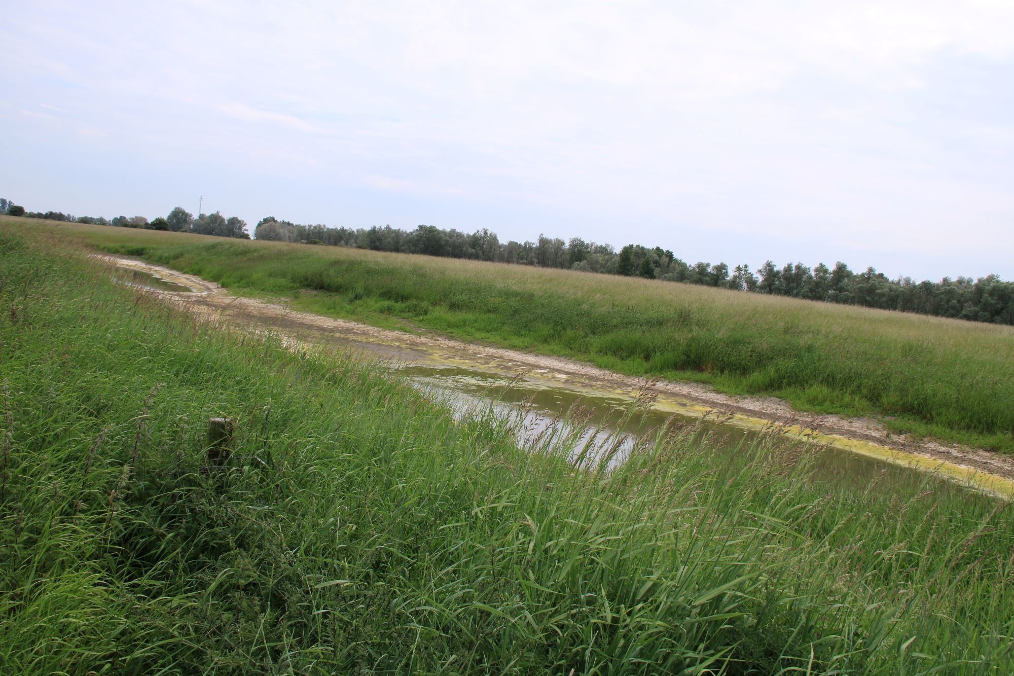 The work that was done last year is showing the first improvements. After a relatively rainy spring, in June some water remains in the deepened tidal pools. In July the second round of construction work will begin: alluvial waters will be restored with heavy equipment. Pumps for artificial irrigation are installed and the weirs will be completed. The installation of an additional polder gate will also make it possible to keep water in the area for a longer period of time, thus counteracting droughts in the long term.